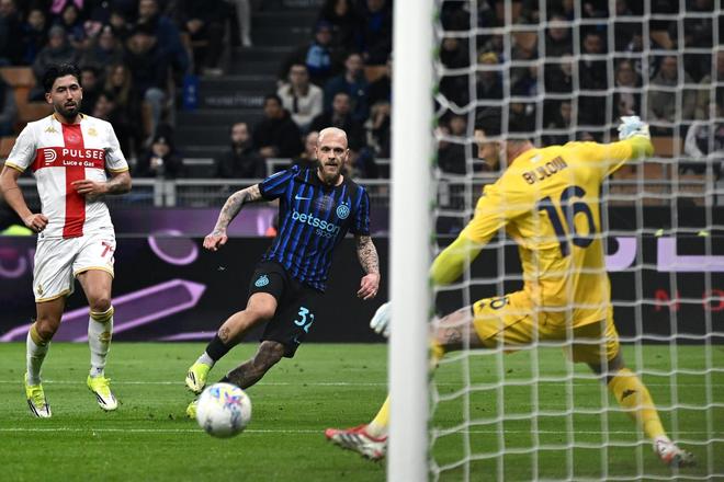 開場后,國米展現(xiàn)出了實(shí)力上的巨大優(yōu)勢,而且率先利用定位球制造威脅,前15分鐘就有德弗里和阿坎吉在角球進(jìn)攻中制造出射門機(jī)會。之后,國米又在運(yùn)動戰(zhàn)中發(fā)力,第16分鐘博尼在禁區(qū)內(nèi)抽射卻被對方門將神勇?lián)涑觯?6分鐘姆希塔良禁區(qū)外的遠(yuǎn)射碰到防守球員發(fā)生折射后擊中橫梁,而在第31分鐘又是博尼禁區(qū)內(nèi)的頭球攻門被門將拒之門外。這三次射門都極具威脅,但奈何對方門將和梅阿查的橫梁都有發(fā)揮,球隊(duì)也一直沒能破僵。